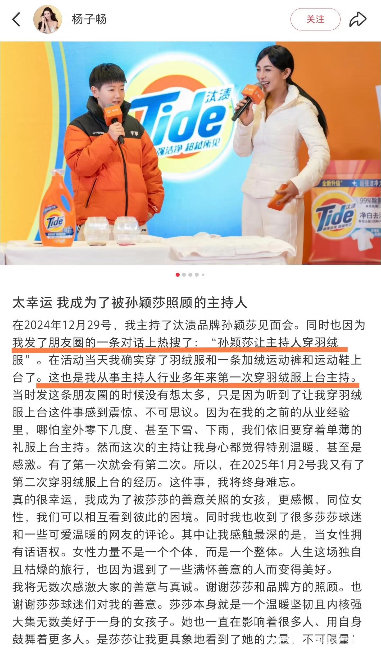 事后,女主持社交媒体发文说:“太幸运了,成为了被孙颖莎照顾的女主持人,这也是她从事主持行业多年以来,第一次穿羽绒服上台主持”